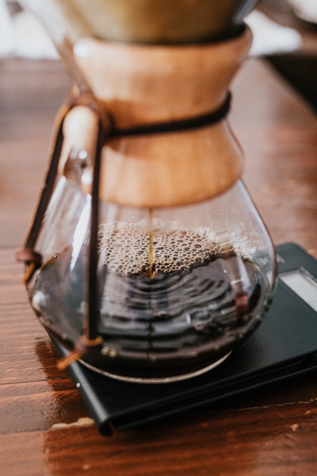Café coado pelo método Chemex. Resulta em um café mais encorpado e com menos amargor.